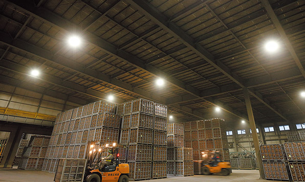 照明のLED化によりフォークリフトが行き交う庫内の視認性が向上し、作業安全性と同時に、作業効率も高まった。「美幌広域連が扱う玉ねぎは、貯蔵・選別施設の稼働期間が他の作物より長い。そのため倉庫の点灯時間も長く、LEDの省エネ性や長寿命化のメリットが十分に発揮できた。生産者のコスト負担も軽減され、私どもが模索していた、農家への新たなメリット提供にも合致するプロジェクトとなった。LED化は地域の話題にもなり、生産者のプライド醸成につながると考えている」(美幌広域連・管理販売部長・山野寺秀紀氏)。