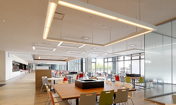 「正門から見ると、ガラス越しにLEDの天井照明のラインが端正に整い、来訪者にも好印象を与えるデザインが実現できた。執務空間では、LED化と机上面照度の見直しで消費電力を軽減、消点灯がスムーズなLED照明は、社員の環境配慮の意識向上を促す目的も果たしている。新設した食堂は、人が近づくと部分的にセンサで照明が電球色に変わる仕組みが導入された。設計者が意図した、人が灯火に集い語らうような『場』が、人感センサと色温度調整で感覚的につくりだされる。これもLEDだから実現できた価値だと思う」(三菱重工コンプレッサ経営統括センター企画経理部事業戦略グループ長・田川敬二氏)。