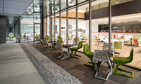 新館の開発コンセプトに基づき、グローバル企業のオフィスとして海外顧客のおもてなしの環境整備、集中とリラックスの切り替えが自然にできる環境づくりの実現、環境負荷の軽減のための効果的な省エネ対策などが求められた。また、今回、新設された食堂は、社員の多様性への対応とともに、昼食時以外でも社員が自然に集い、対話・打ち合わせができる雰囲気の創出もデザイン上の課題となった。