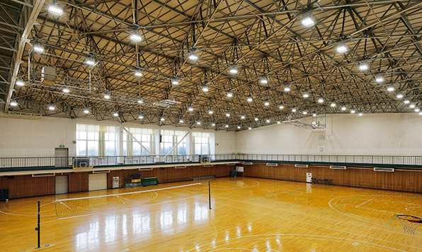 理科実験室にはLEDの学校用照明器具と黒板灯を採用。まぶしさを防ぎ板書が鮮明で、授業に集中できる環境を実現した。講堂の白熱電球はLEDベースダウンライトに、体育館の水銀ランプはLED高天井用器具にリニューアルし、明るさを競技や行事によって最適化する無線調光システムを導入。このほか、放課後利用が多いスペースでは、人の出入りが多いため人感センサによるきめ細かな点消灯・調光管理で効果的な消費電力削減を実現した。