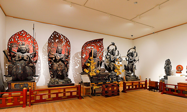 ロウソクや線香を焚く御堂の天井には、熱負荷が少ないLED照明を格天井の格間や竿縁の寸法に合わせ、意匠や雰囲気に調和する照明器具を提案。LEDの光の品質の確認のために、境内の建物の一部で約半年間の点灯実験を行い、既存照明と比較しながら、歴史的建造物の室内の趣に馴染む色温度を検証した。「霊宝館」では、演色性に優れたLED照明で展示照明を改善。光のちらつきのない静謐な展示環境をつくりあげた。