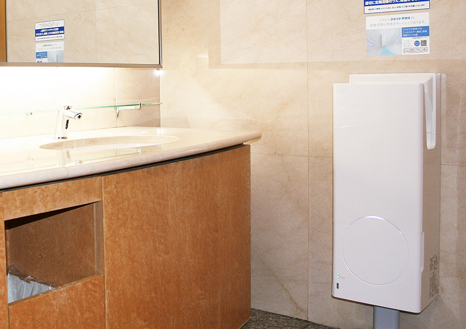 2022年3月には、来館者用7カ所と従業員用1カ所、計8カ所のトイレでハンドドライヤーを更新。来館者の方々に安心してご利用いただくことを目的に、最新の「ジェットタオルスリムタイプ衛生強化モデル(JT-SB116LH-W)」をご採用いただきました。