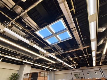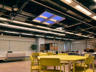 遊休スペースの有効活用として、カフェのような内装にリニューアルしたエリアにmisolaを4台連結して導入しました。スケルトン天井に設置することで、さらなる開放感を演出しています。周囲に設置したMyシリーズ色温度可変器具と連動させ、スケジュールで照明シーンを変化させています。照明により普段と異なる雰囲気、環境を醸し出し、アイデアが生まれやすい環境づくりに貢献しています。