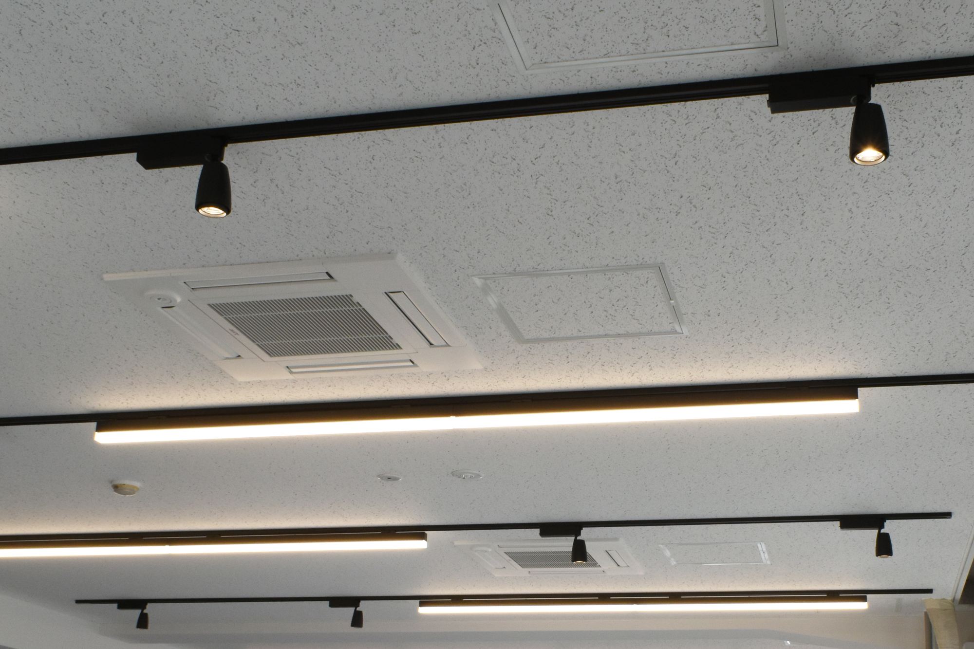 電源はダクトレールから供給されるため、配線工事が不要でレイアウト変更にも柔軟に対応でき、デザイン性と機能性を兼ね備えた照明として、空間演出にお使いいただけます。スケルトン天井の空間にもおすすめです。