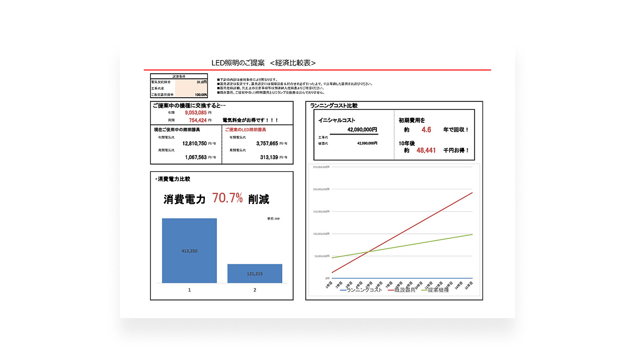 台数、点灯時間などお使いの環境を追加で入力すると、既存光源からLED照明器具に更新した際の省エネ効果を比較、グラフで表示します。