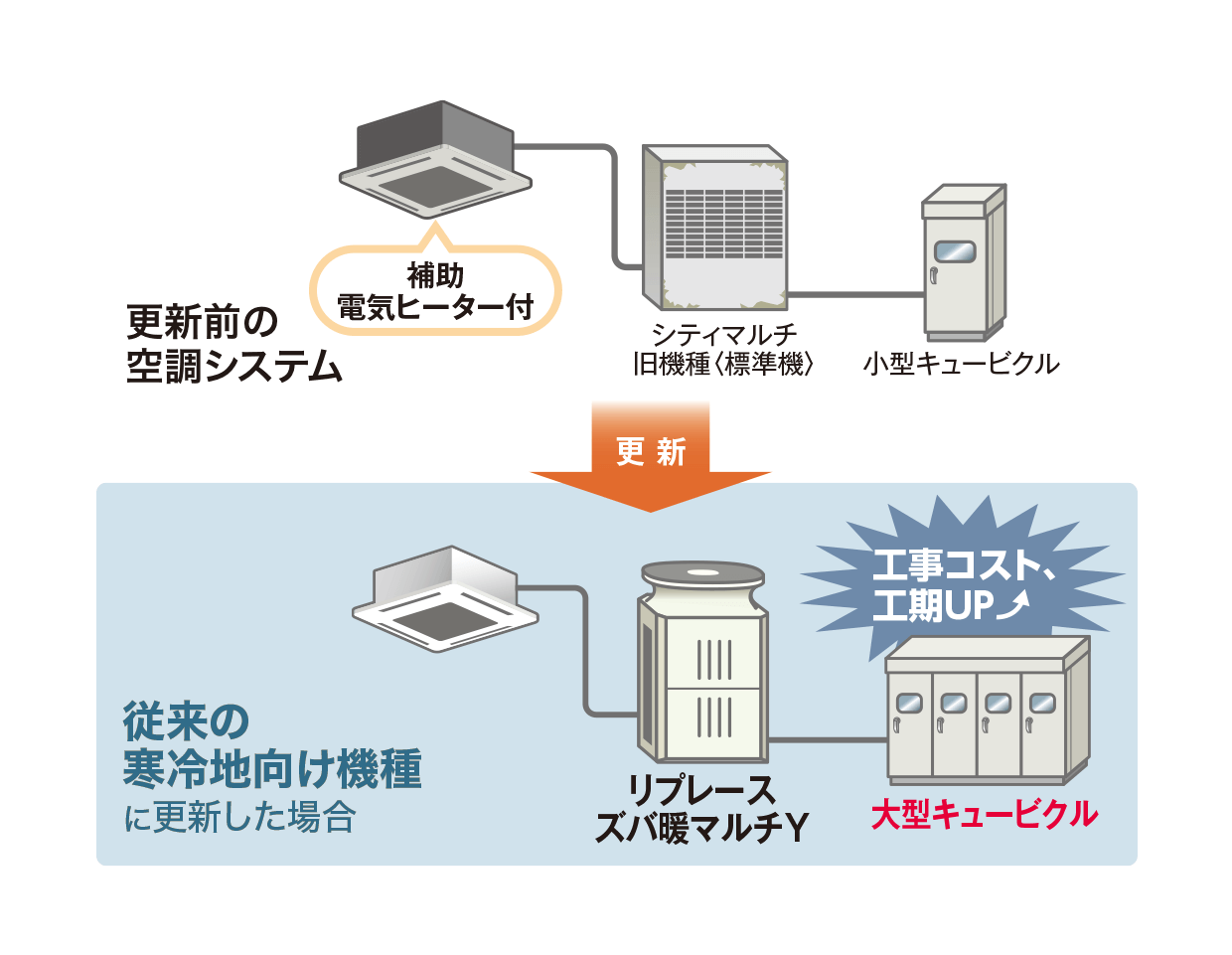 従来の寒冷地向け機種に更新した場合、最大電流値が上がり、キュービクルの容量を変更しなければならないケースもあり、その場合、工事コスト・工期がかかってしまいます。