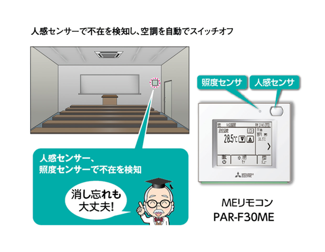 消し忘れの多い教室では、センサーで人の不在を検知し、自動で運転停止に切替えます。