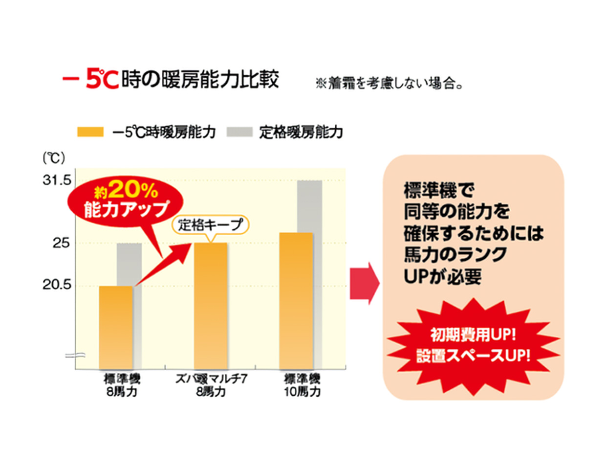 リプレースズバ暖マルチ7は-7℃まで定格暖房能力をキープできるから標準機と比べて馬力ランクアップが不要。