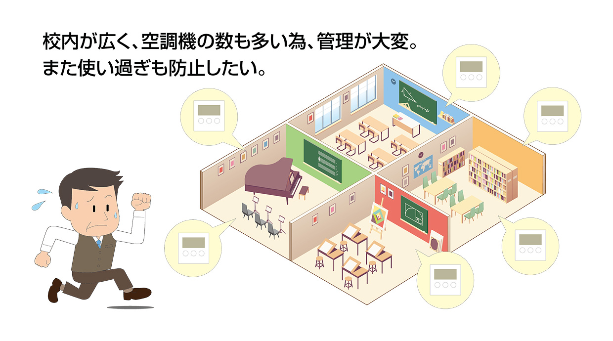 他社製のGHP(ガス式)空調機を18年間使用しており故障が増えてメンテナンス費用もかさんでいます。校内が広く台数も多いため管理が大変で、使い過ぎを防止しながらできるだけ更新費用を抑えたいと考えています。