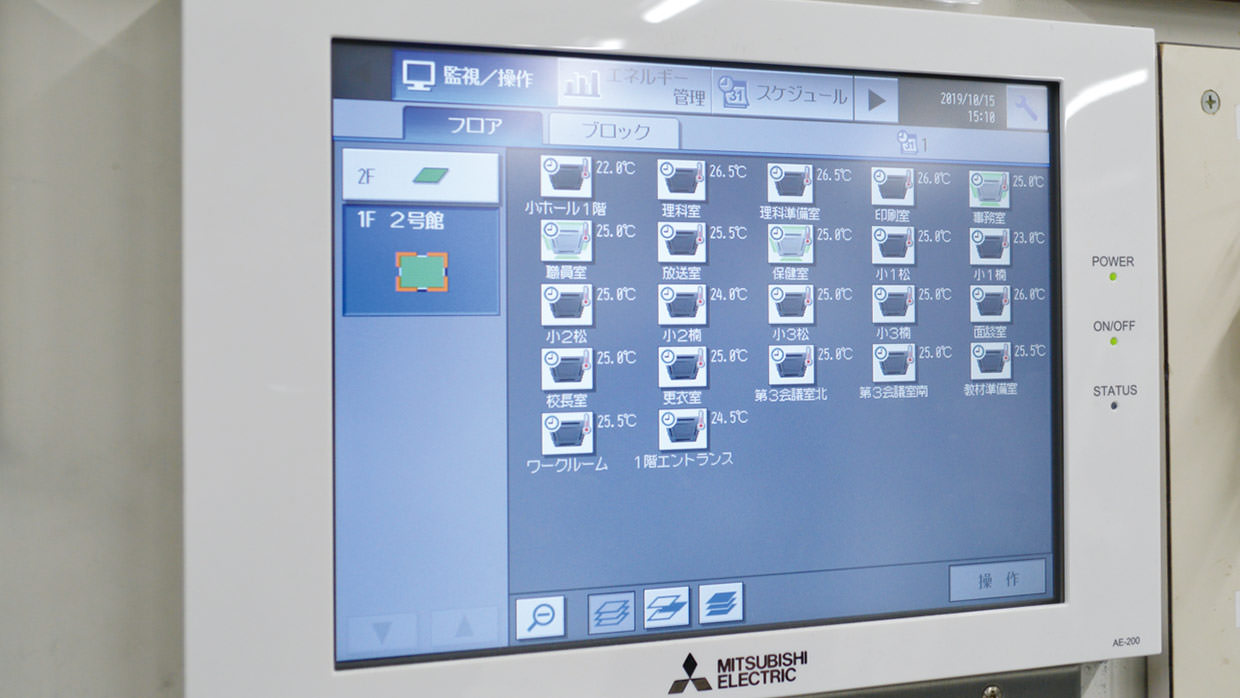 空調冷熱総合管理システムAE-200Jを活用し、職員室・事務室から一括管理。省エネピークカット制御ライセンス(オプション)の登録により、きめ細かい省エネ運転を実施し、電気料金(デマンド契約料金)を削減します。