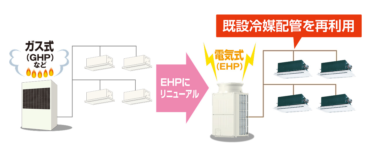 特別な資格や専任者が不要となり、保守・メンテナンス性にも優れたEHP(電気式)空調機への更新が可能