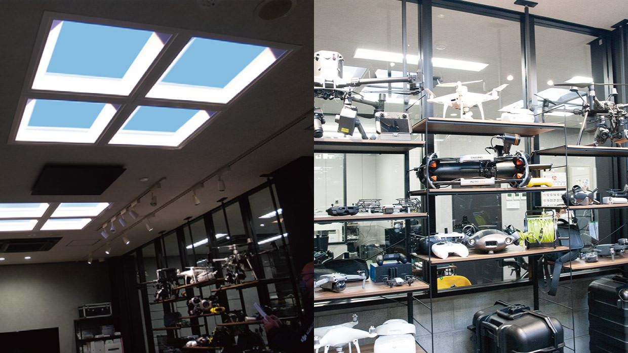 ドローンのショールームには、奥行き感のある青空を表現する青空照明misolaを採用