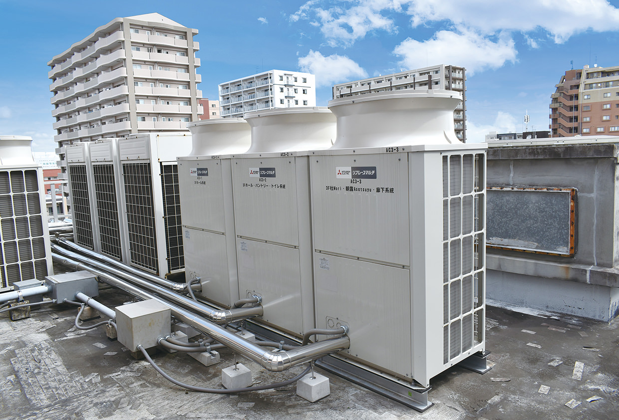 設置台数:外機:PUHY-RP140DMG9他、5系統 室内機:PLFY-P36HMG9他 21台 集中リモコン:AE-200J 1台 遠隔監視接続用デバイス:MCC-50J 1台 対象機種(例)