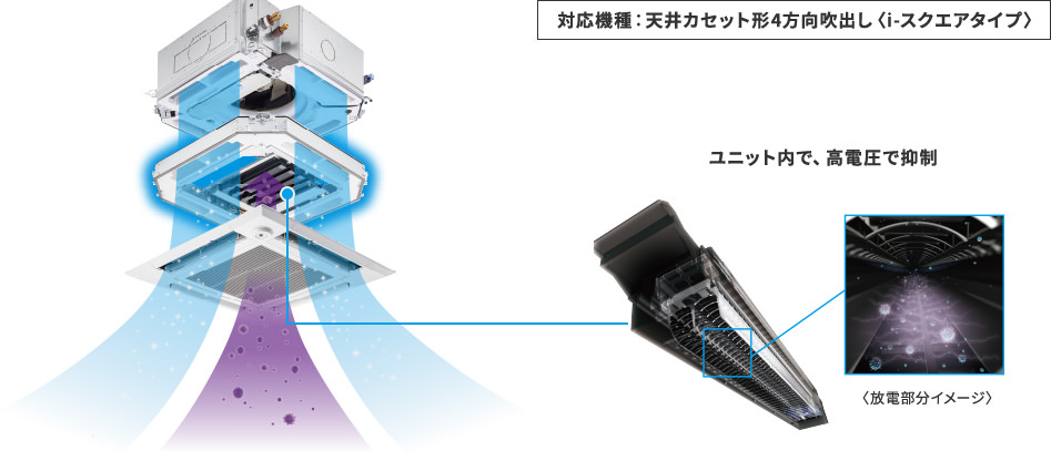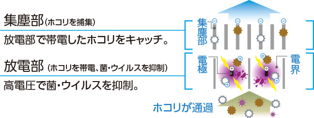 ユニットを通過する空気中の菌※1、ウイルス※2などを高電圧で抑制。さらに、微細なホコリも帯電させて、集塵部の静電気でキャッチします。