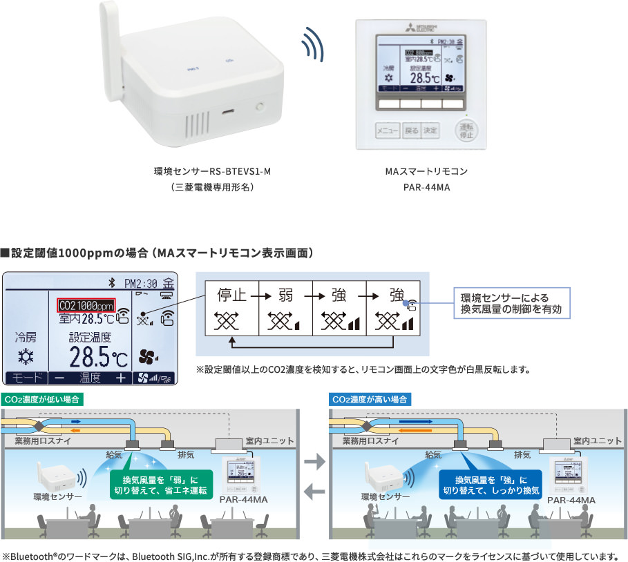 - ※本制御およびCO2濃度の表示については、手元リモコンMAスマートリモコン(PAR-44MA)が必要です。RS-BTEVS1-Mは三菱電機株式会社の保証対象外 です。保証の取扱い等については、ラトックシステム株式会社へお問い合わせください。