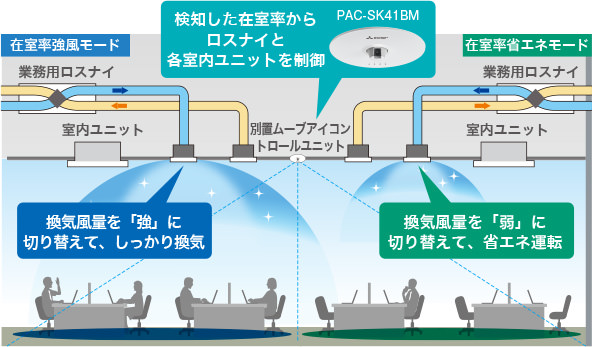 業務用ロスナイ®とビル用マルチエアコンと別置ムーブアイコントロールユニットで在室率に応じた、快適&省エネ運転