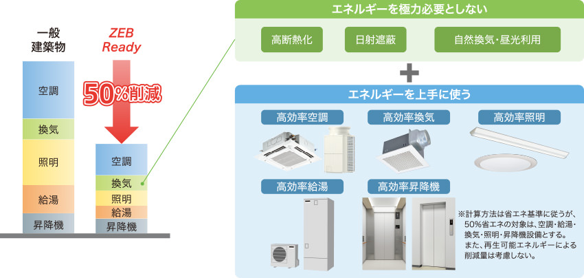 ZEB実現のベースとなる基準一次エネルギー消費効率50%以上低減の実現を目指した受注仕様をラインアップ。