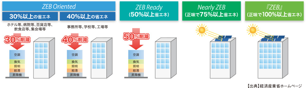 正味で100%以上省エネを達成したものを『ZEB』 - 建築物の延べ面積が10,000m2以上で、再生可能エネルギーを除く一次エネルギーを30%以上(ホテル等、病院等、百貨店等、飲食店等、集会場等)、40%以上(事務所等、学校等、工場等)削減したものをZEB Oriented