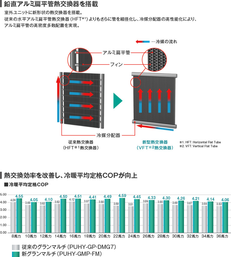 冷媒ガスと冷媒液を均等に混合する二重管構造の高性能冷媒分配器により、微細な冷媒流路で構成されるアルミ扁平管を高密度に多数実装を実現した「鉛直アルミ扁平管熱交換器(VFT熱交換器)」を搭載することで消費電力の削減に貢献します。