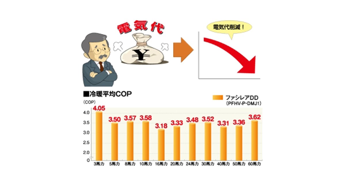 ファシレアDDは業界トップクラス(2018年7月現在(当社調べ))のCOPを発揮!既設機に比べて電気代の削減が可能です。