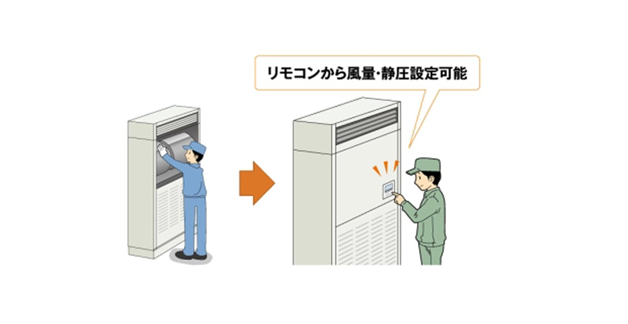生産設備の変更に伴いダクトのレイアウトを変更する可能性もあるが、その際に空調機の風量静圧変更作業が困難。ファシレアDDならリモコンから風量静圧の設定変更ができ、ダクトのレイアウト変更があった場合でも柔軟に調整が可能。