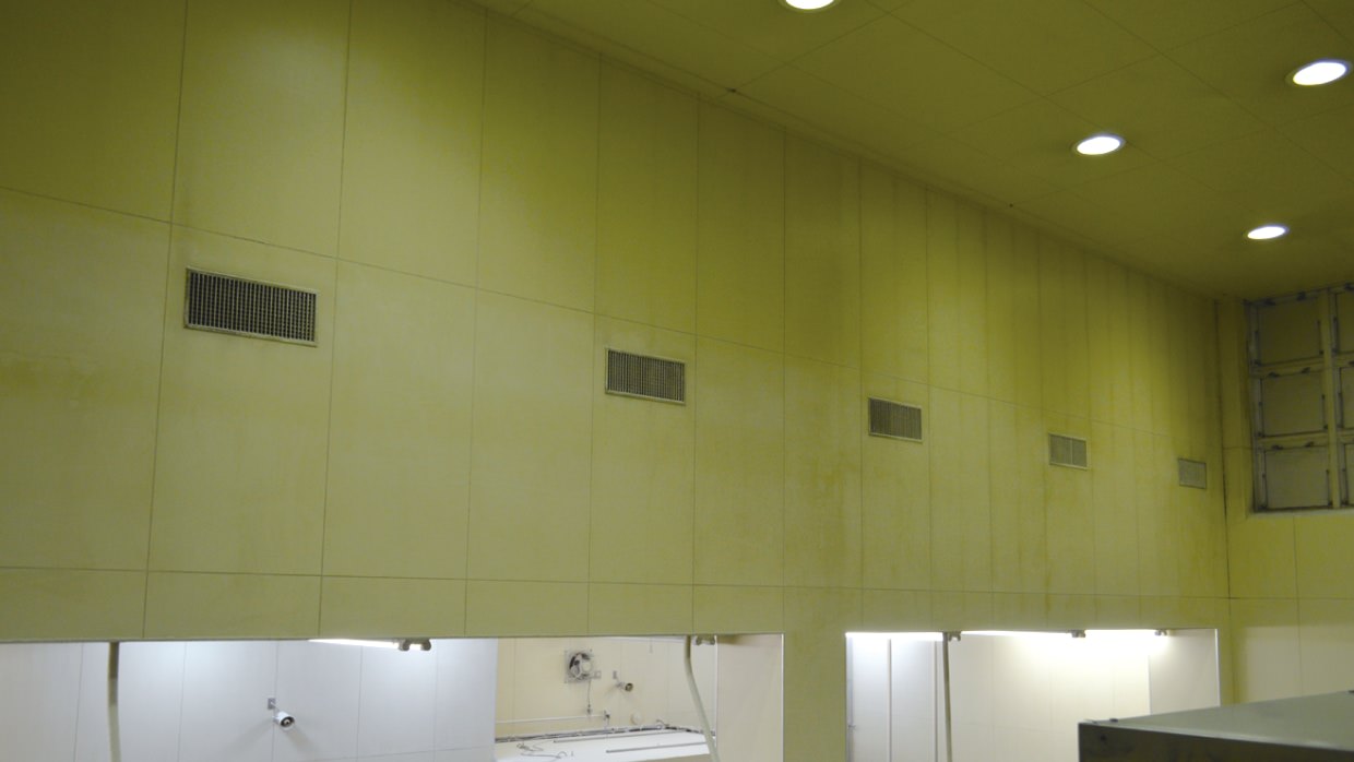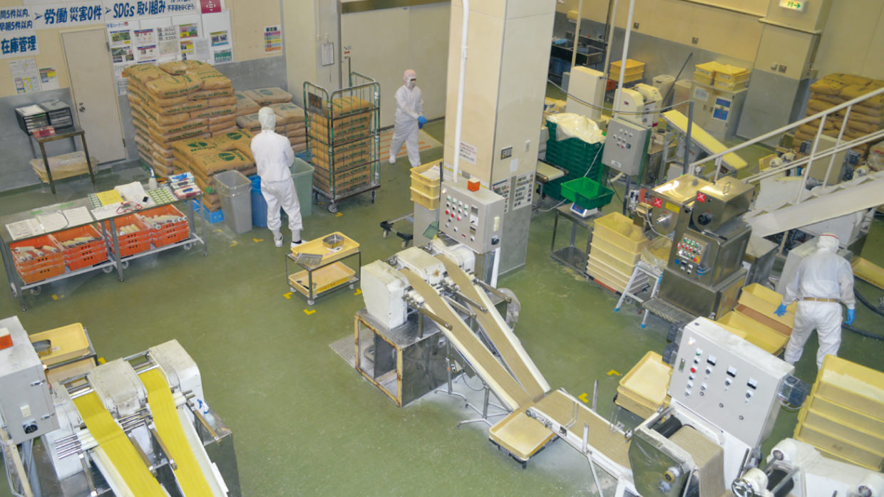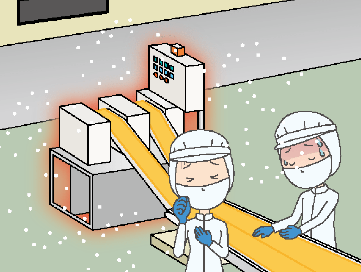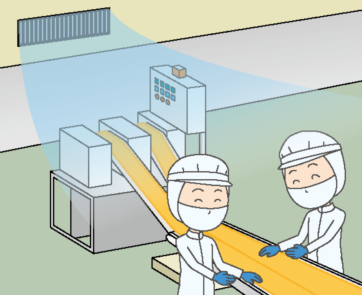 生産設備からの発熱が大きく、また製麺工程で粉が飛びやすい環境なので室内空気の循環は難しい。