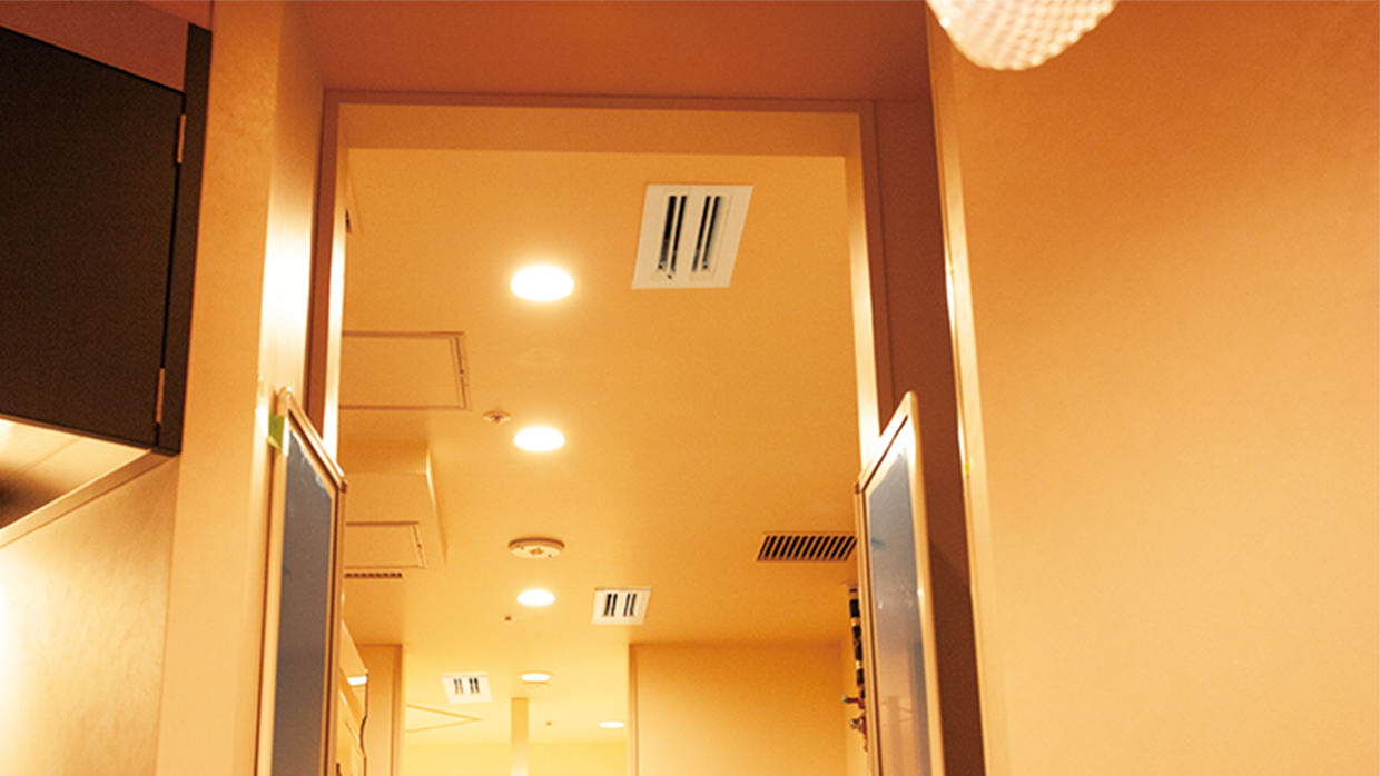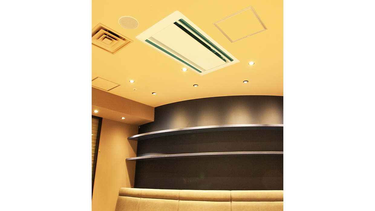 その内装と調和するシンプルなパネルデザインの空調機は、三菱電機の水冷式パッケージエアコン(天井カセット形)。地下街の空調は全体の営業時間に合わせて稼働するため、主に朝の営業時間帯の冷房用として、天井カセット形・天井埋込形、計6台を採用いただきました。水配管は共用部から引き込むだけという点も好条件だったといえます。
