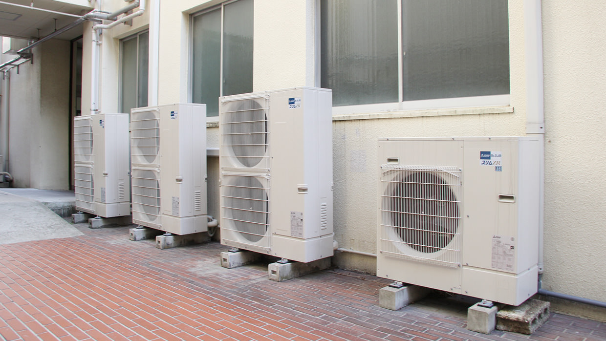 校舎脇やベランダに設置されたスリムZRの室外ユニット