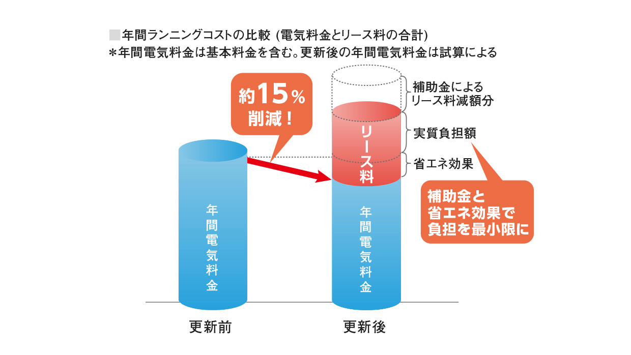 補助金によって月々のリース料は大幅に減額。さらに、省エネ機種の電気代削減効果で負担は最小限に。