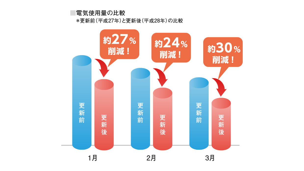 空調・照明の省エネ効果によって電気使用量は更新前(前年同月)と比べて約30%削減。