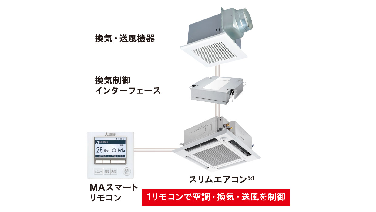 様々な換気・送風機器とスリムエアコンを連携制御。室内環境の快適性・清潔性を効率よく高めます。
