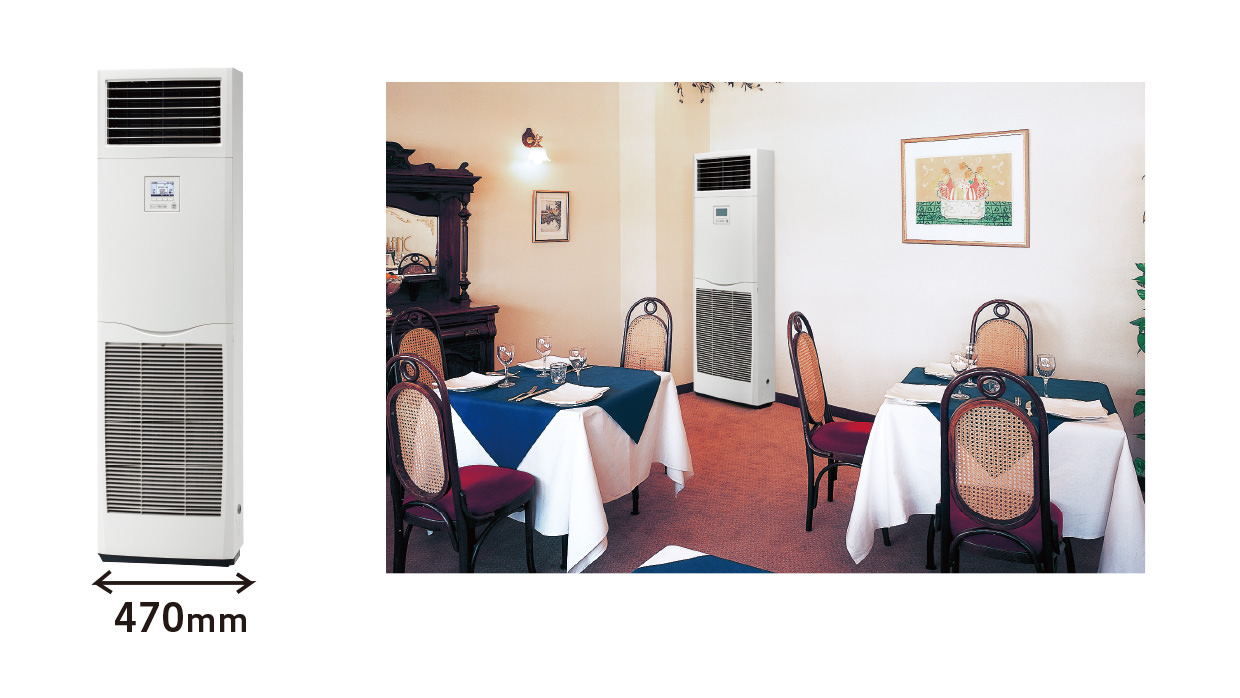 業界No.1※2スリムな横幅470mm(P50~P80形)で、狭いスペースにもすっきり収まります。既設の床置形があるスペースにそのまま設置できるので、リニューアルに最適です。