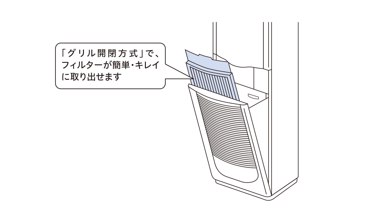最大2,500時間(一般事務所の場合)メンテナンスレスの「ロングライフフィルター」を標準装備。面倒なフィルター掃除の回数を減らしました。また「グリル開閉方式」の採用で、フィルターに付着したチリ・ホコリが舞いにくく、取り出しもスムーズです。