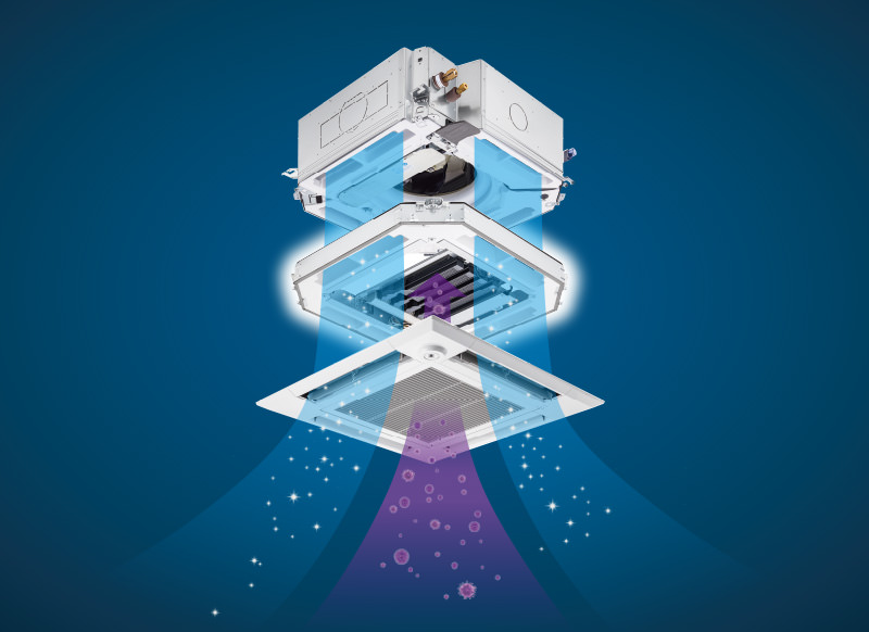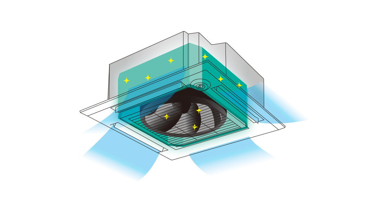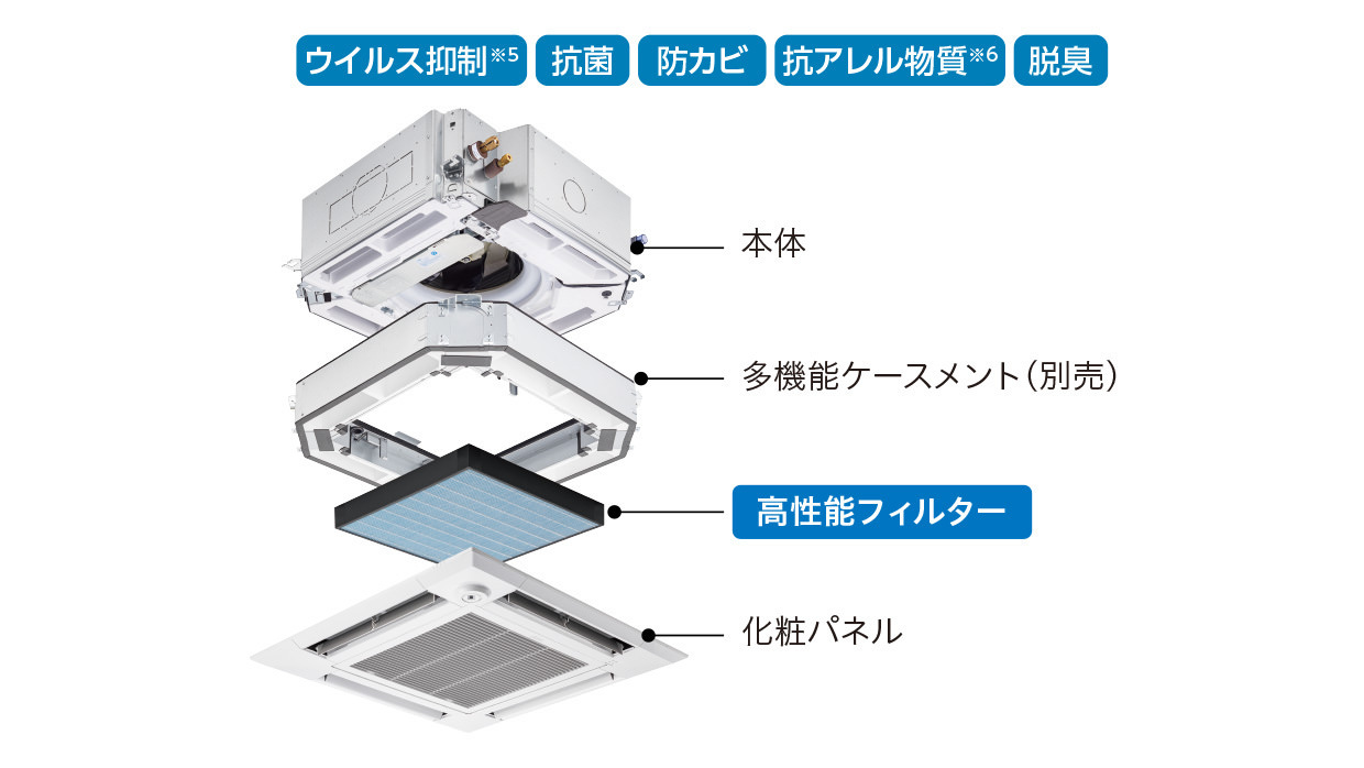 - *2時間後のフィルターに付着したウイルスへの効果であり、実使用空間での実証結果ではありません(4方向天井カセット形において)。