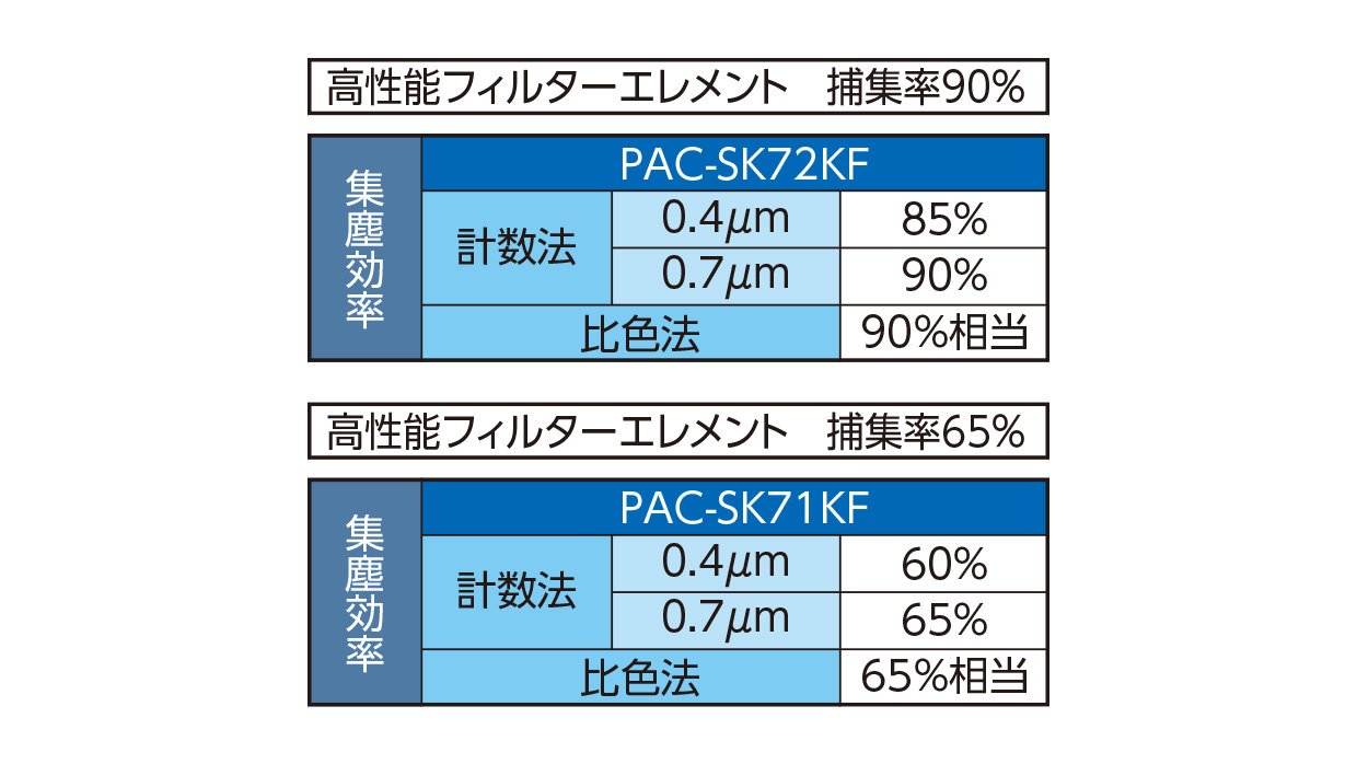 - *計数法はJIS B 9908:2011による粒子捕集率(粒径別)。