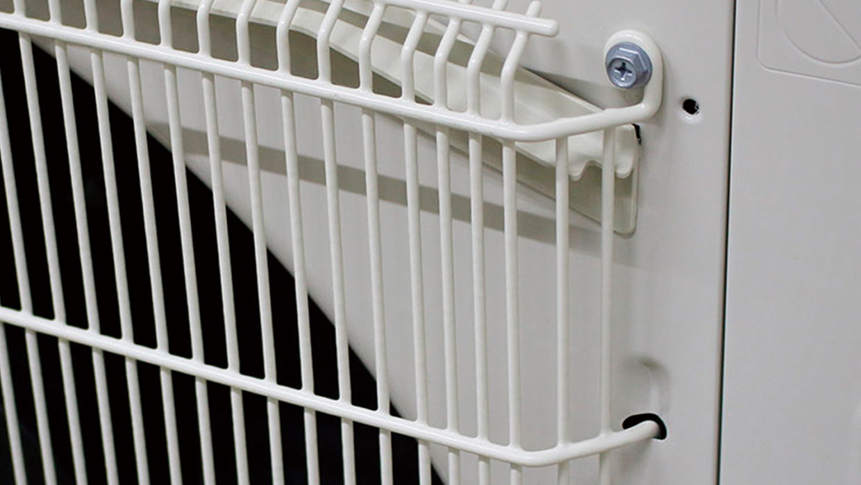 安全性を高めるため、室外ユニット吹出口には、割れにくく燃えにくいグリルを採用しています。丈夫なグリルを採用することで、より長く安心してご使用いただける品質を確保しています。