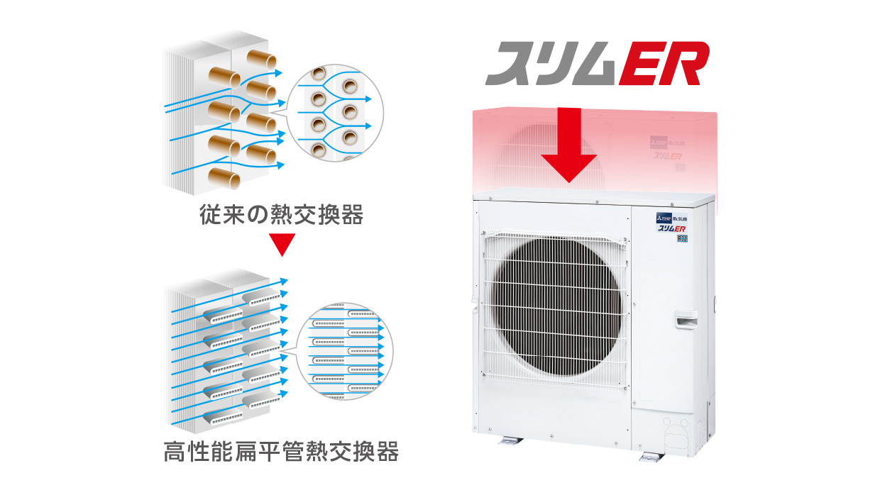 スリムER(P112~P160形)において、高性能扁平管熱交換機の搭載など、設計の工夫によって小型化を実現。