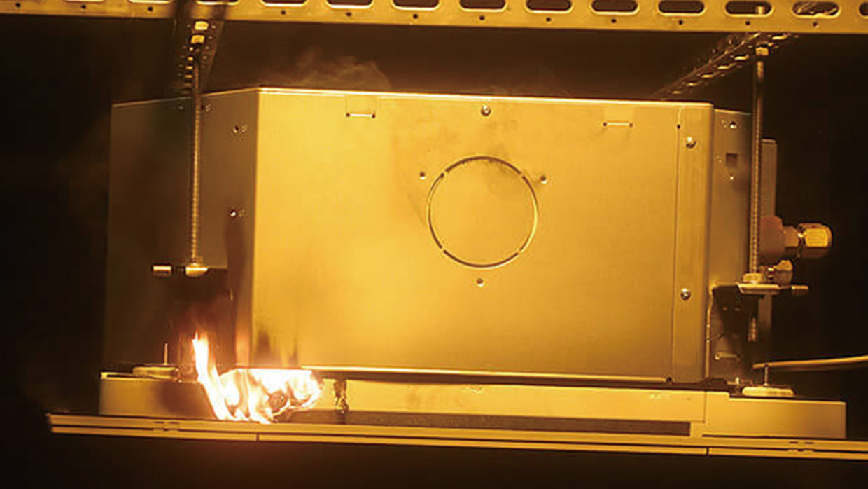 実際に製品に火を放つ試験を実施。万一の発火の際に製品に及ぼす影響について確認しています。
