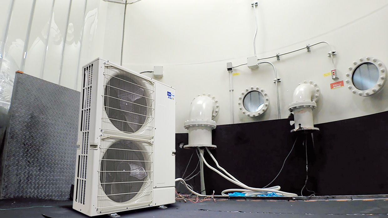 猛暑の夏や極寒の冬などさまざまな環境でも止まらず運転し続けられるよう、検証試験を実施。-25℃~52℃までの温度条件を再現できる試験室での運転試験や風雨試験を行い、エアコンの性能を確認しています。
