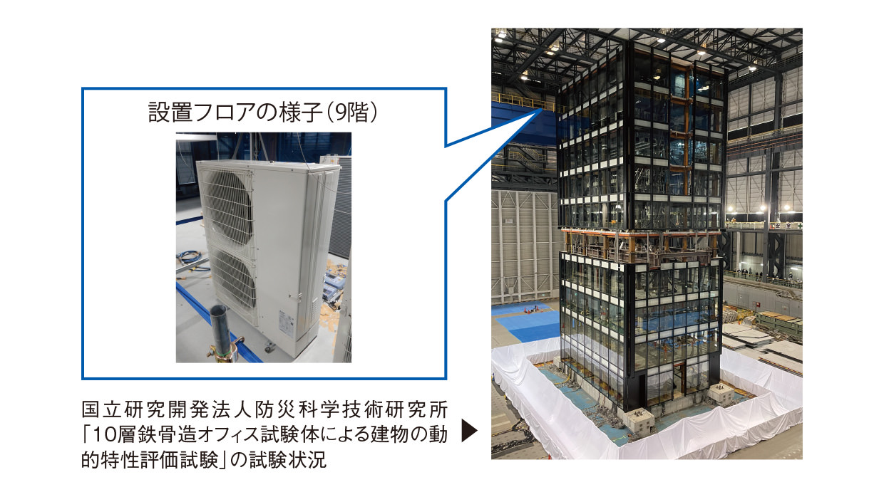 試験室外ユニット:PUSY-FP280MH2。 - ※4:外装材を忠実に再現した実大規模の中層ビル震動実験(2023年2月実施)。試験体:10階建て鉄骨造オフィスビル(平面形状12.0m×8.0m、高さ26.9m、重量約700トン)設置ユニット:PUSY-FP280MH2(9階フロアにアンカーボルト固定)