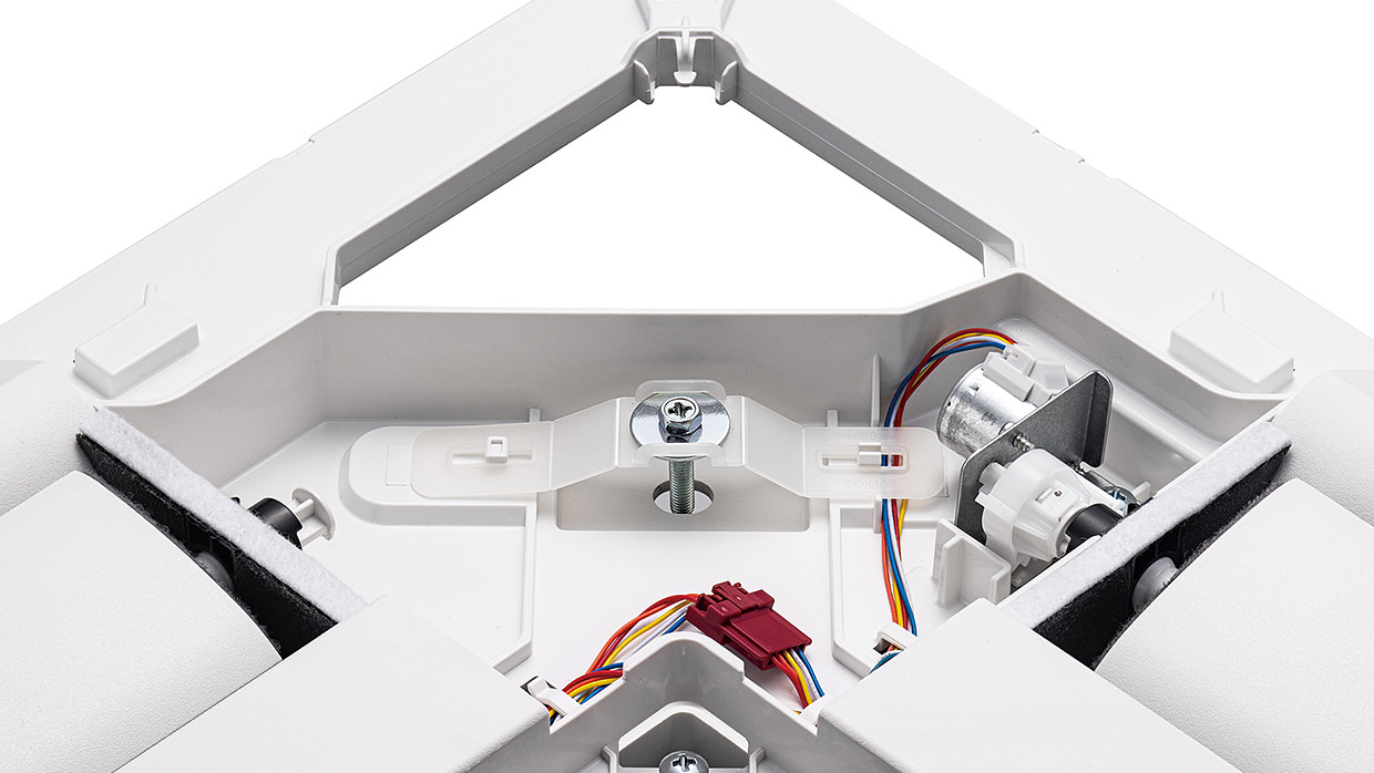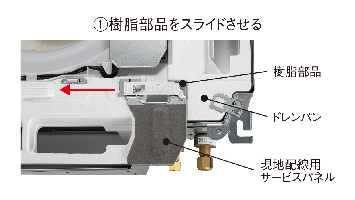 樹脂部品をスライドし、回転させる構造でネジ緩め作業が不要に。工具レス化により、据付性を向上。