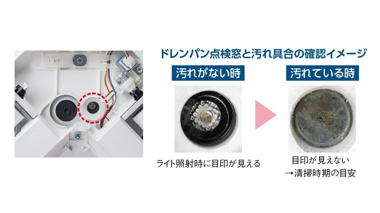 ドレンパンに透明な窓を設けて、汚れ具合が確認可能に。ドレンパンを取り外さずにお手入れ時期が分かり、メンテナンス性を向上します。