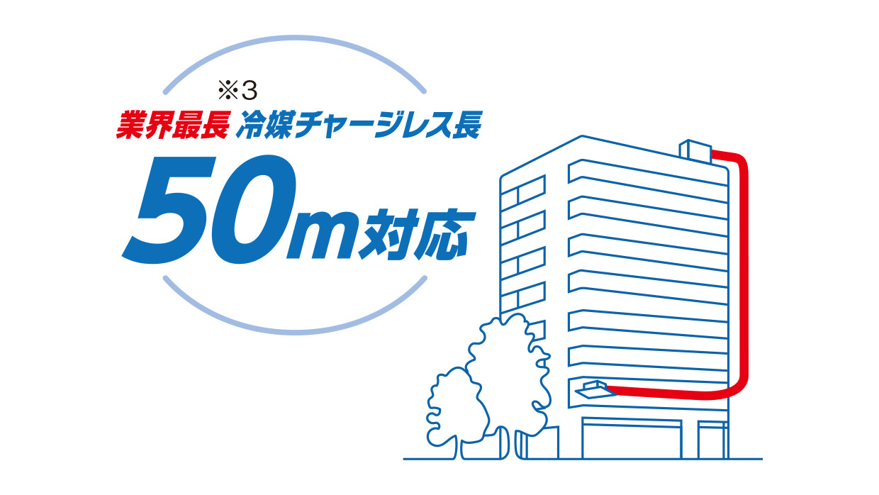 冷媒封入量を従来※2から増やすことなく、チャージレス長50mに対応。