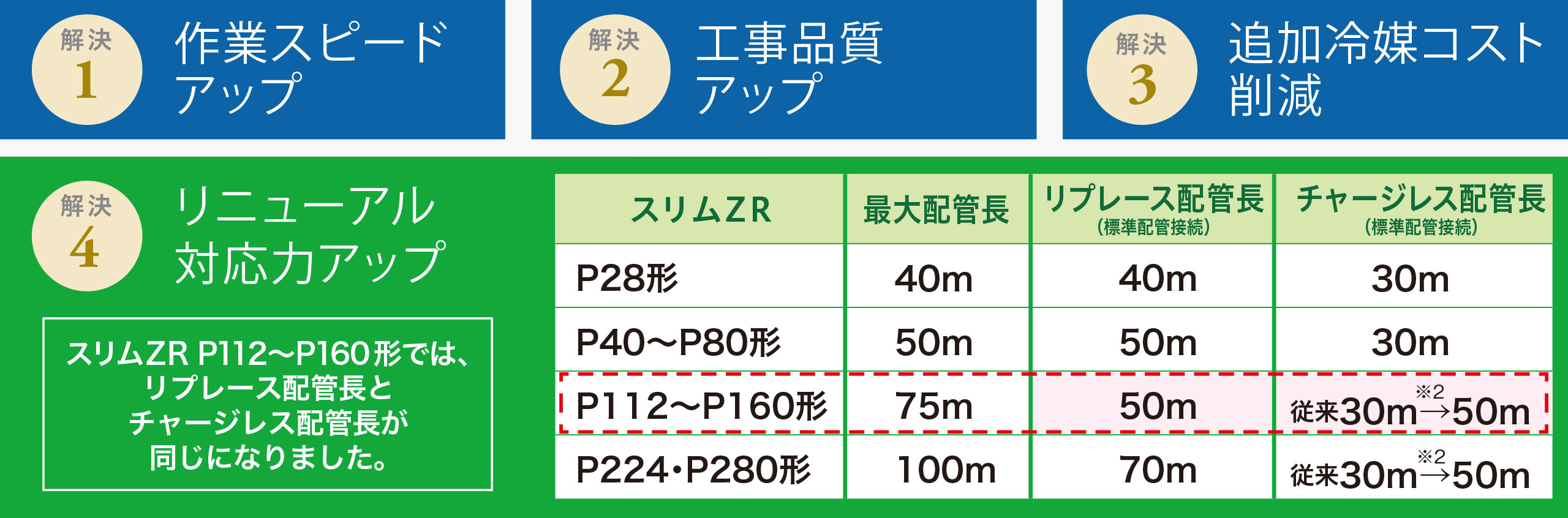 最長50mまで洗浄レス・追加冷媒チャージレスでリプレース可能(スリムZR P112形~P280形)