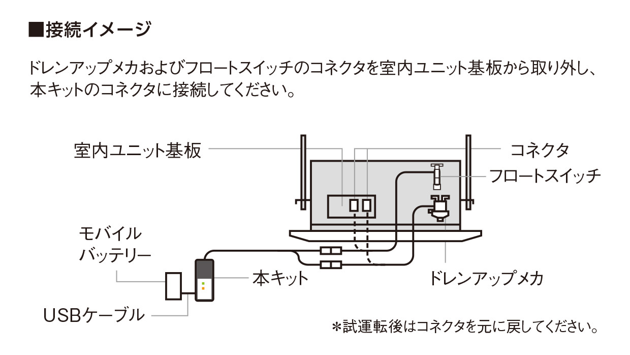 電気工事の進捗に左右されずに、電源が通っていない現場でもドレンアップメカの試運転作業が可能。室内ユニットの据付作業効率化や工程管理の改善に貢献します。モバイルバッテリーと電池のどちらも使用が可能です。