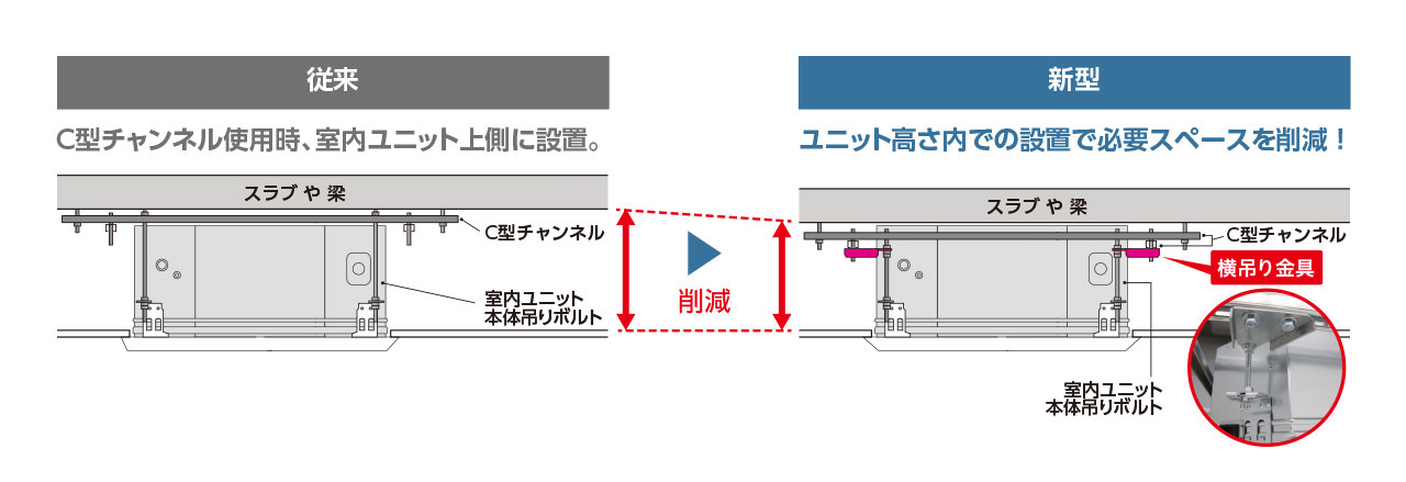 C型チャンネルなどの鋼材使用時に、天井裏の必要スペースが増大してしまうお悩みに対処すべく、ユニット高さ内での設置を実現する「横吊り金具」を開発しました。