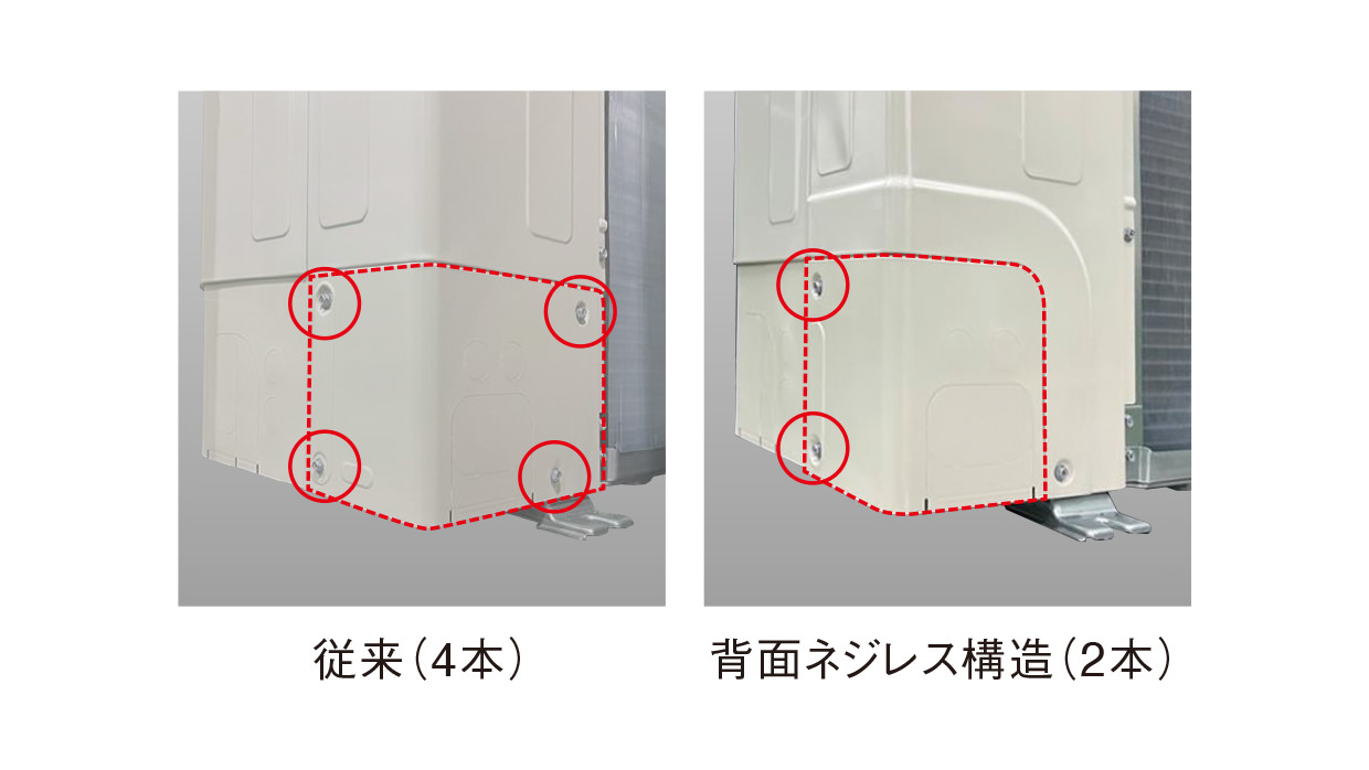 スリムER P112~P160形の背面カバーパネルに、背面ネジレス構造を新採用。ネジ止め本数の削減による作業時間を短縮し、壁際に据付ける際の作業性を改善します。