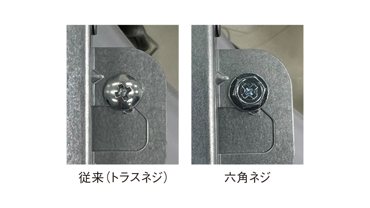 室内ユニットで使用している電気品カバーなどの固定ネジの一部に、六角ネジを新採用。ネジ穴がつぶれた場合でもスパナ等で確実に取外しが可能となり、施工性を大幅に向上させます。