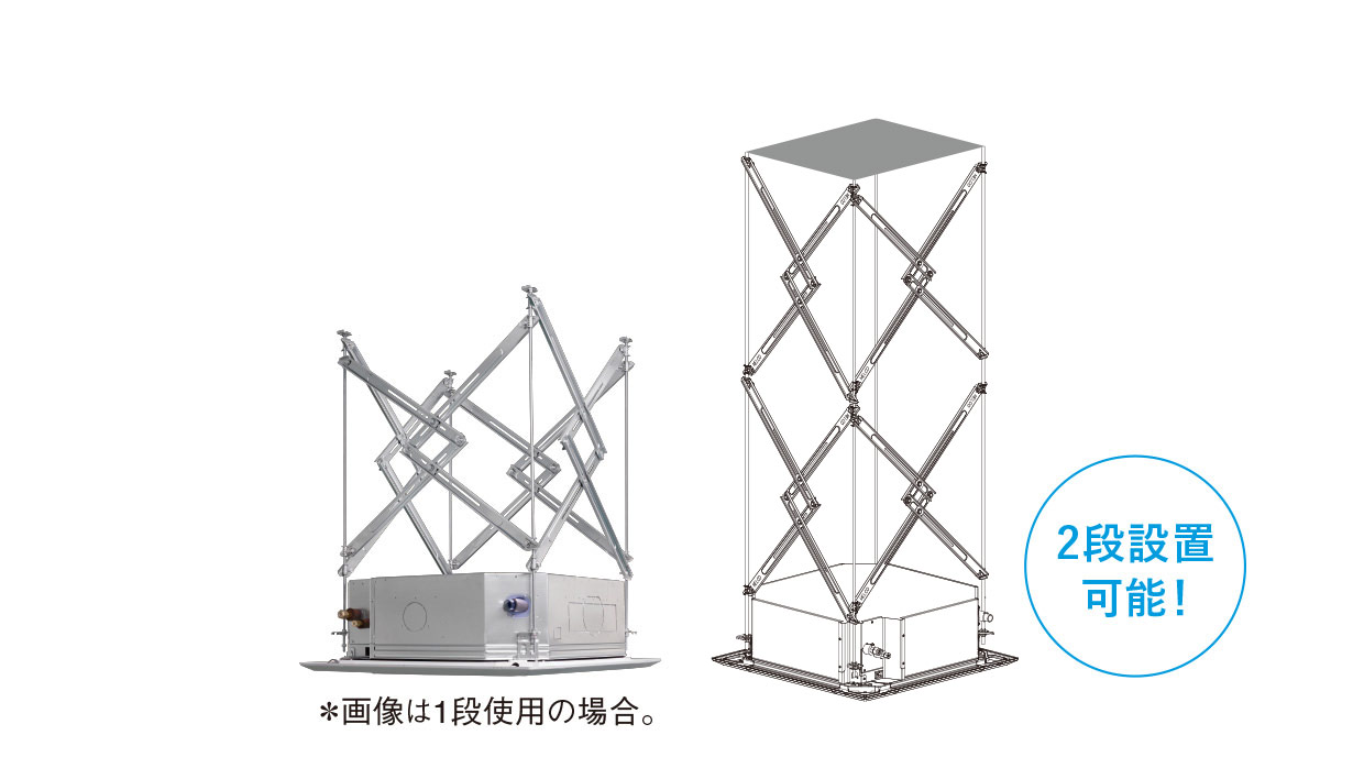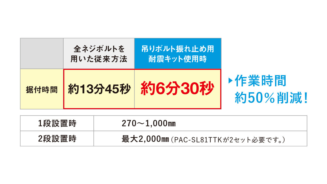 - *室内ユニット上部~天井スラブまでの寸法が1,000㎜の場合。天井材なし。1人作業。取付けは、脚立を使用。従来方法:全ネジボルトにて吊りボルト間を交差で4面補強した場合との比較(当社調べ)。