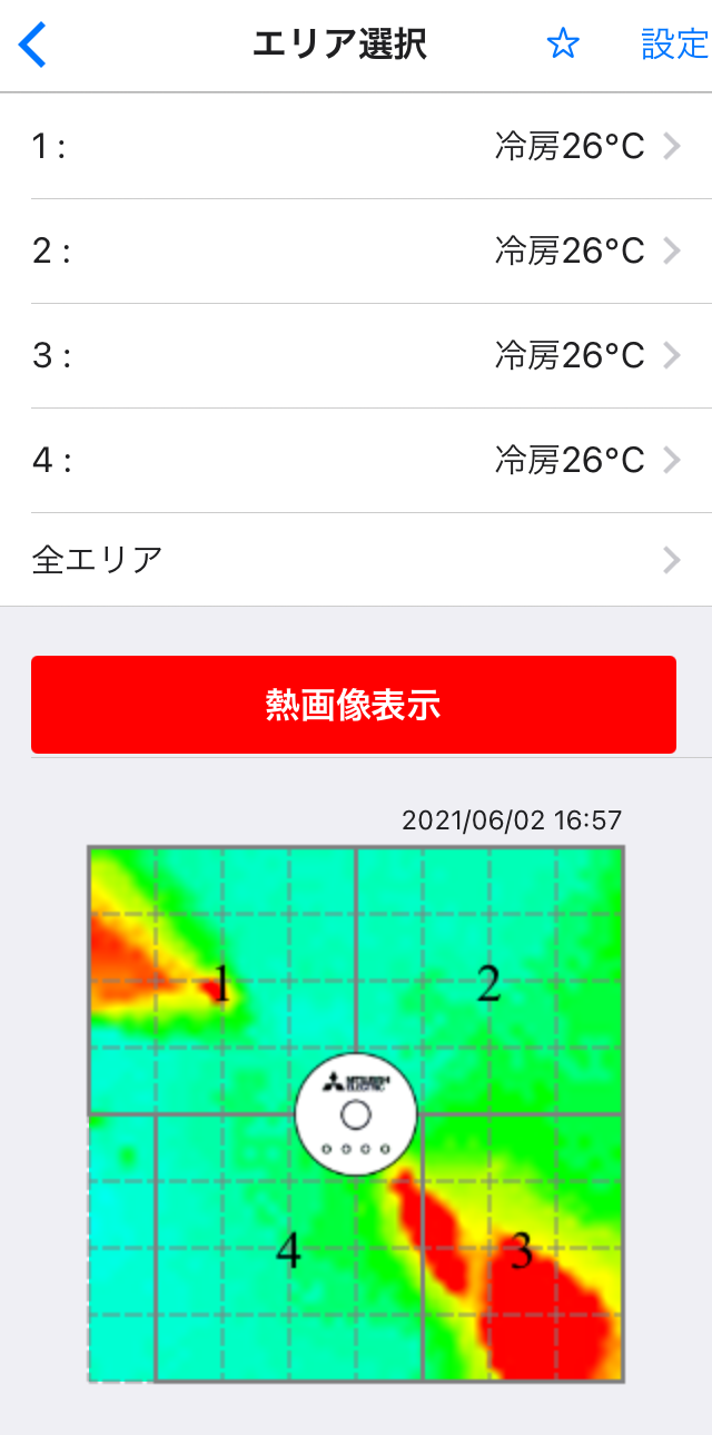 熱画像が表示されました。室内の温度状態が確認できます。 引き続き、エアコンの操作機能を体験いただけます 温度ムラをタップして、該当するエリアの空調機を操作できます。 *本画面はイメージ画像です。実際のアプリ画面ではありません。